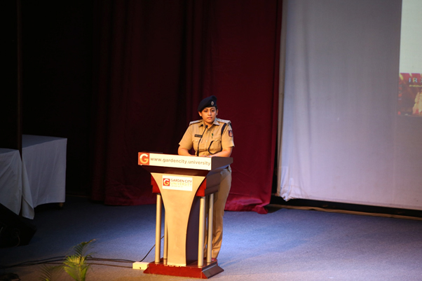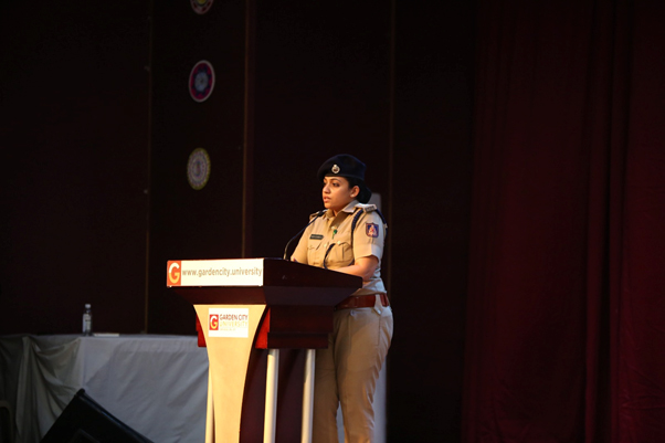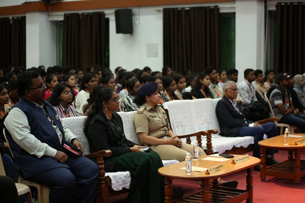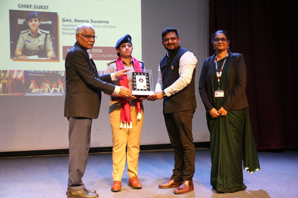 The Guest of Honour, ACP Reena Suvarna N, presently serving as Assistant Commissioner of Police for the Whitefield subdivision in Bengaluru, addressed the assembly with authority and compassion. In her address, she outlined specific sections of law under which ragging is punishable, shared case studies from recent enforcement, and urged both seniors and juniors to act as guardians of peer respect. She stressed the importance of early reporting, counselling, and institutional accountability in eliminating ragging culture.