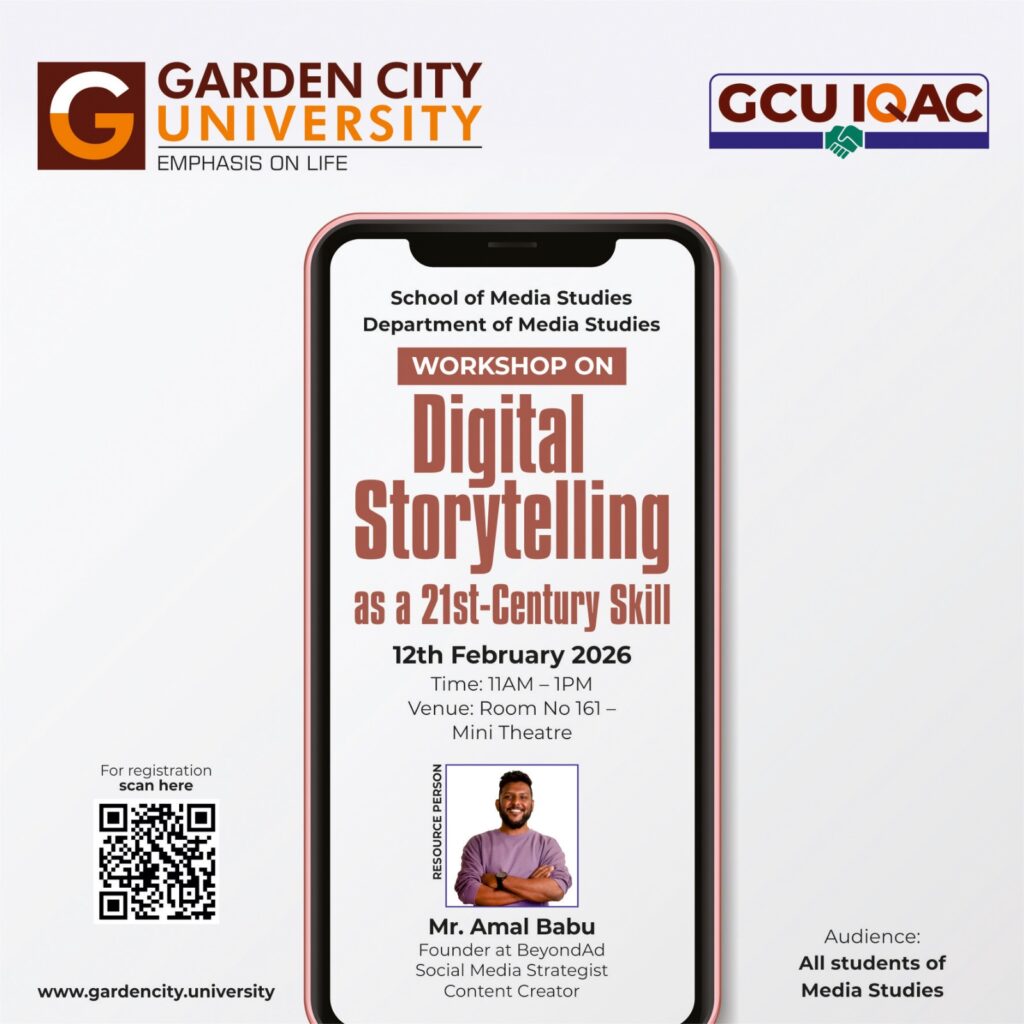 The School of Media Studies at Garden City University organized a Skill Development Workshop titled “Digital Storytelling as a 21st-Century Skill” on 12 February 2026 at Room No. 161 – Mini Theatre. The workshop aimed to introduce students to storytelling techniques essential for contemporary digital platforms.