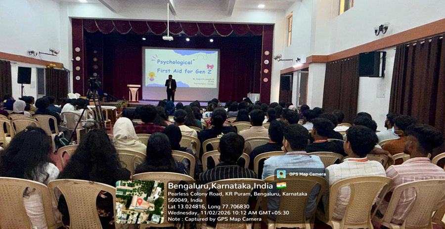 The Department of Psychology, Garden City University, organized a workshop on Psychological First Aid for Gen Z on 11 February 2026 at the GCU Auditorium. The session, led by Mr. Augustin Joseph, focused on identifying emotional distress, providing immediate psychological support, and promoting empathetic responses among students. Participants from UG, PG of the psychology department, and Computer Science programmes actively engaged in learning essential mental health support skills.